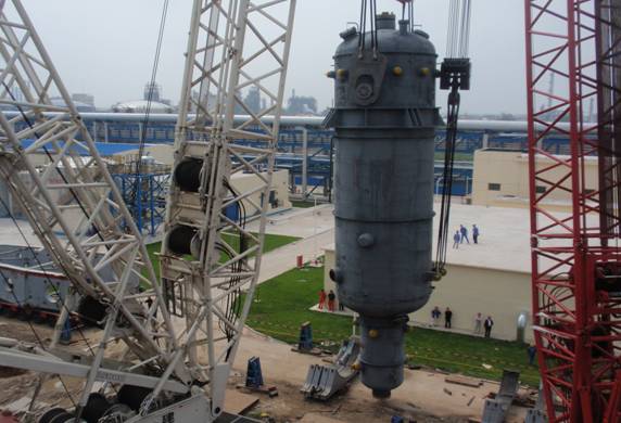 因反應器(R-110/120)業主委托中國外運北京祥龍物流有限公司從營口港陸地運到施工現場,待吊裝完進場的第一臺R-110后,運輸車返回,再運輸第二臺進場。項目部對反應器的吊裝高度重視,建立了吊裝領導小組和吊裝工作小組,并從專項吊裝方案的報批、落實,現場吊車吊裝站位基礎的處理、吊裝人員的配備、進行了詳細的技術和安全交底入手,做了認真、細致和充分的工作準備,吊裝時采用1000噸主吊、750噸溜尾。整個吊裝:第一臺反應器R-110從吊裝索具的懸掛到起吊就位僅用了3小時48分鐘;第二臺反應器R-120從吊裝索具的懸掛到起吊就位僅用了2小時48分鐘。