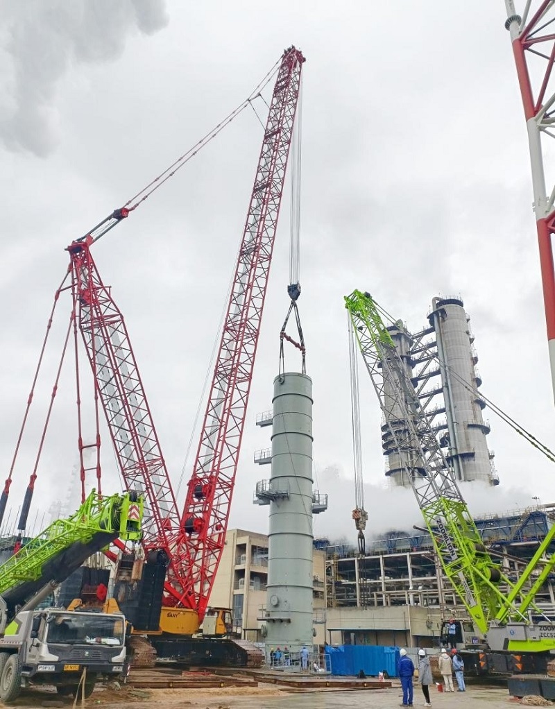 該設(shè)備重量為120.6噸、筒體直徑4.6米、高28.29米,是項(xiàng)目的核心設(shè)備,屬大型吊裝作業(yè)。為確保安全順利完成吊裝,項(xiàng)目部編制了專項(xiàng)施工方案和措施,對(duì)現(xiàn)場(chǎng)全體施工人員進(jìn)行了安全技術(shù)交底。在吊裝過(guò)程中,項(xiàng)目施工一線人員嚴(yán)格按照方案施工,努力克服吊裝工作場(chǎng)地狹小、工序多、技術(shù)要求高的不利影響,緊密協(xié)作、共同努力,整個(gè)吊裝過(guò)程有條不紊,實(shí)現(xiàn)了一次吊裝成功。